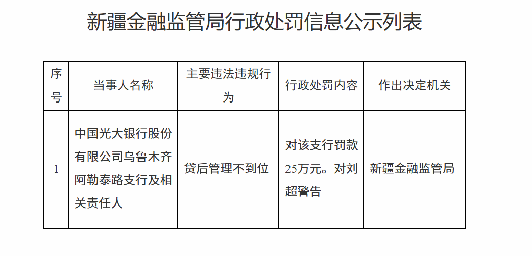 11月11日,新疆金融监管局行政处罚信息公示列表显示,中国光大银行股份有限公司乌鲁木齐阿勒泰路支行及相关责任人因贷后管理不到位被罚款25万元。刘某被警告。