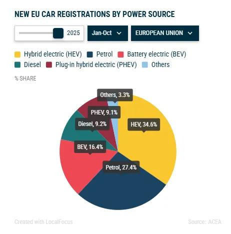 2025年1月至10月,欧盟纯电动车的市场渗透率仅为16.4%,较往年同期仅提升了3.2个百分点,总量也仅为147.34万辆。市场对纯电动车的需求显得尤为疲软,消费者对燃油车的偏好并未发生根本性的转变。