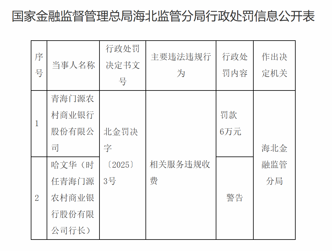 11月12日,国家金融监督管理总局海北监管分局行政处罚信息公开表显示,青海门源农村商业银行股份有限公司因相关服务违规收费被罚款6万元,哈某华(时任青海门源农村商业银行股份有限公司行长)被警告。